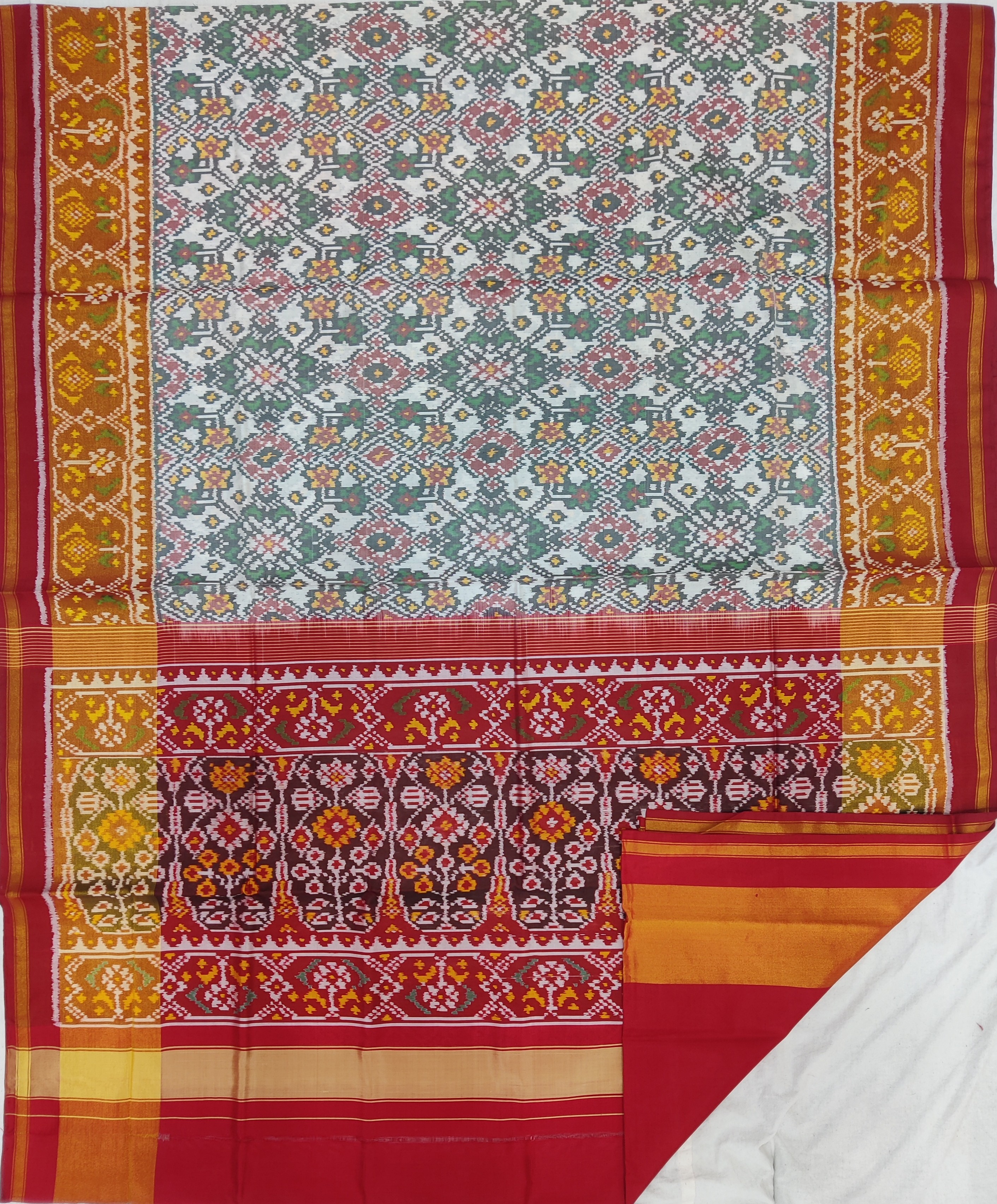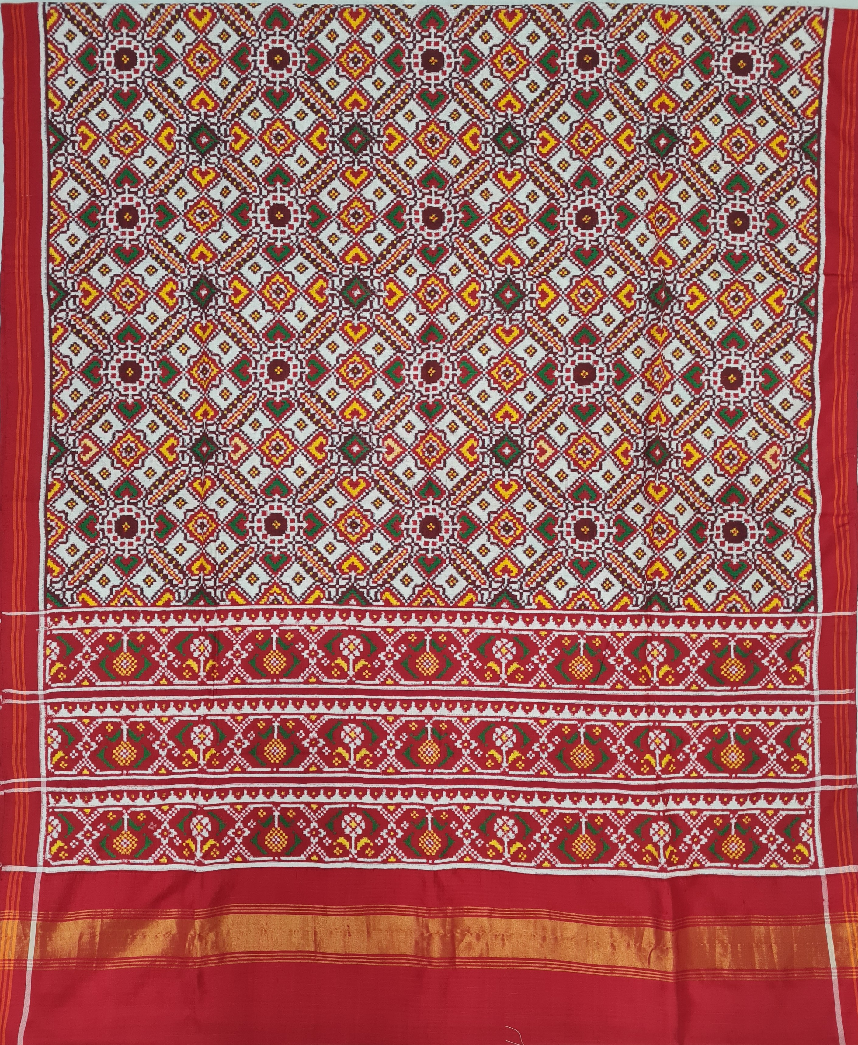 Design: Nauratan, Color: White-Red Material: 100% pure Mulberry silk, Weaving: Single Ikkat. Loom: Handloom Care: Dry clean. *Note: Color variation may occure in real and this product has been woven by hand and may slight irregularities taht are natural outcome of human involvement in the process. T&C apply.