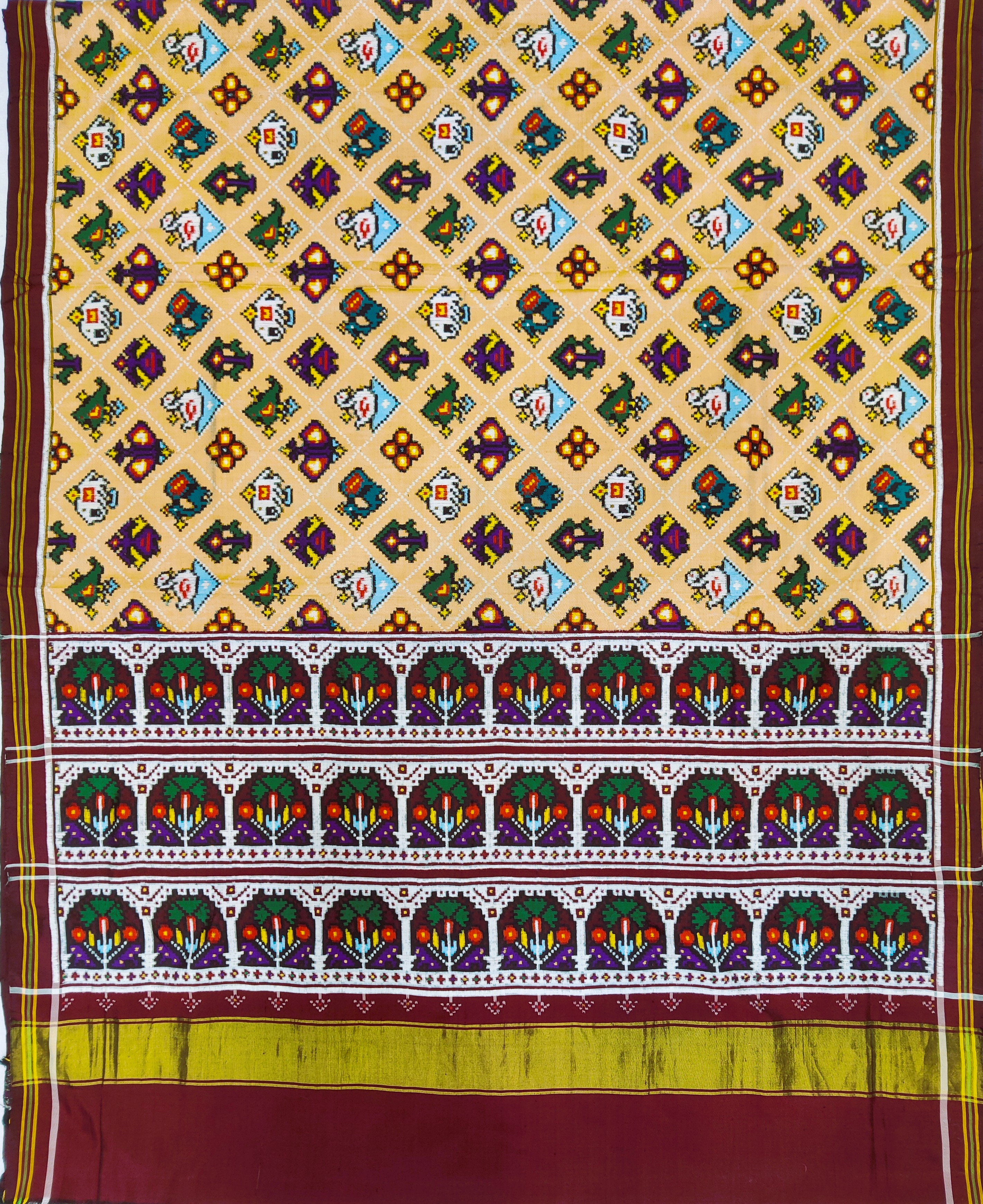 Design: Nauratan, Color: Maroon Material: 100% pure Mulberry silk, Weaving: Single Ikkat. Loom: Handloom Care: Dry clean. *Note: Color variation may occure in real and this product has been woven by hand and may slight irregularities taht are natural outcome of human involvement in the process. T&C apply.