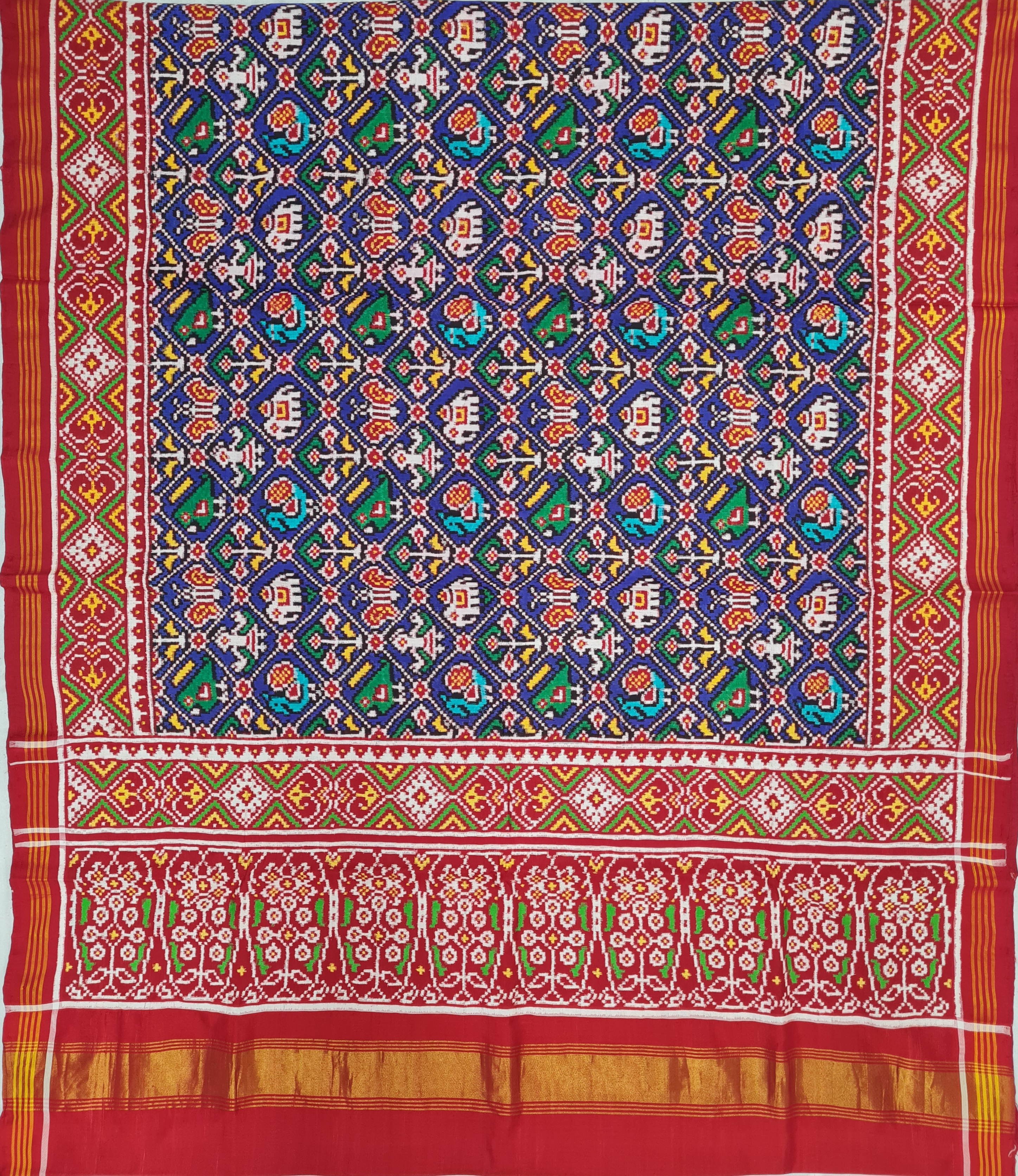 Design: Narikunjan, Color: Blue-Red Material: 100% pure Mulberry silk, Weaving: Double Ikkat. Loom: Handloom Care: Dry clean. *Note: Color variation may occure in real and this product has been woven by hand and may slight irregularities taht are natural outcome of human involvement in the process. T&C apply.