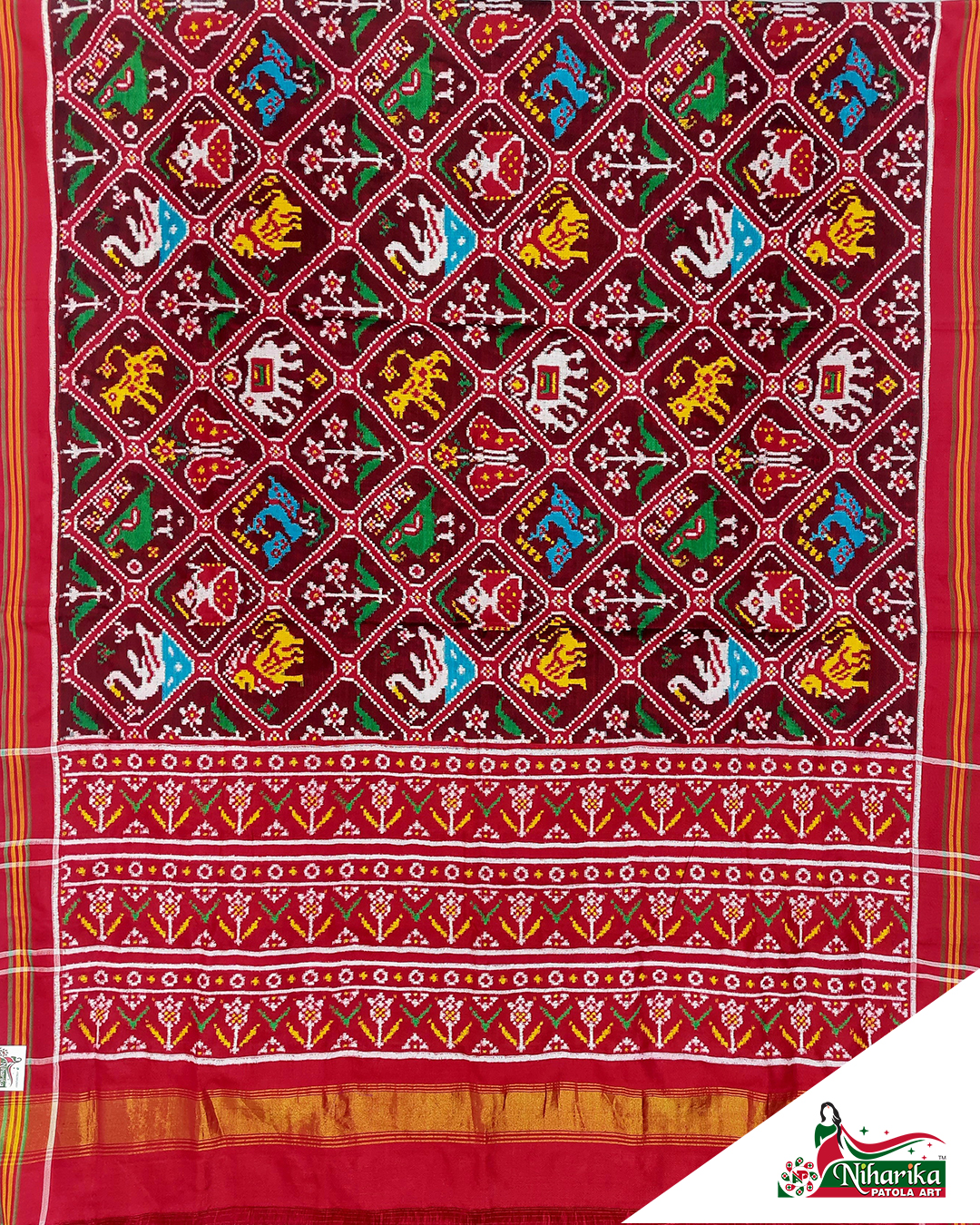Design: Narikunjan, Color: Maroon-Red Material: 100% pure Mulberry silk, Weaving: Double Ikkat. Loom: Handloom Care: Dry clean. *Note: Color variation may occure in real and this product has been woven by hand and may slight irregularities taht are natural outcome of human involvement in the process. T&C apply.