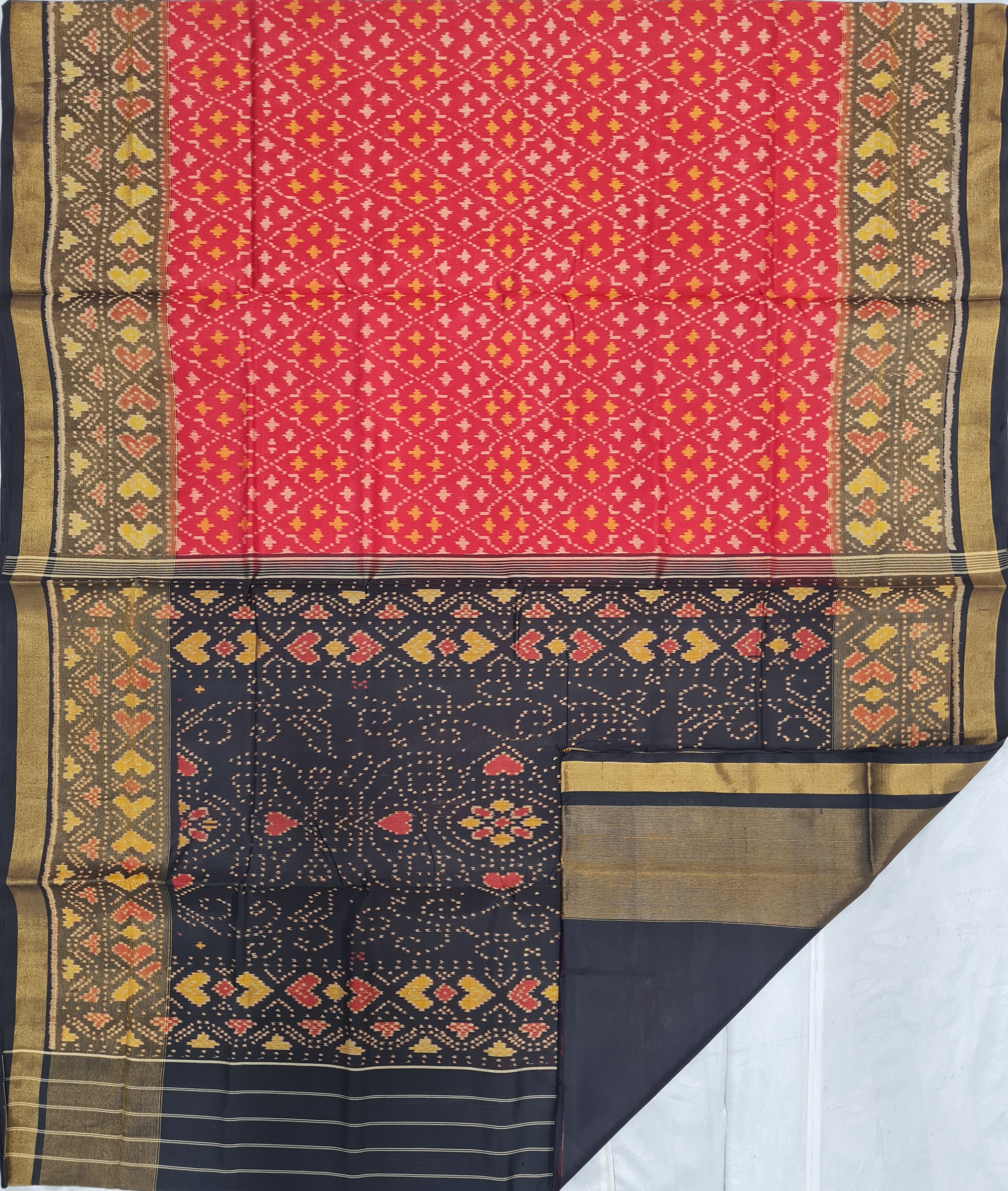 Design: Fancy, Color: Red-Black Material: 100% pure Mulberry silk, Weaving: Single Ikkat. Loom: Handloom Care: Dry clean. *Note: Color variation may occure in real and this product has been woven by hand and may slight irregularities taht are natural outcome of human involvement in the process. T&C apply.