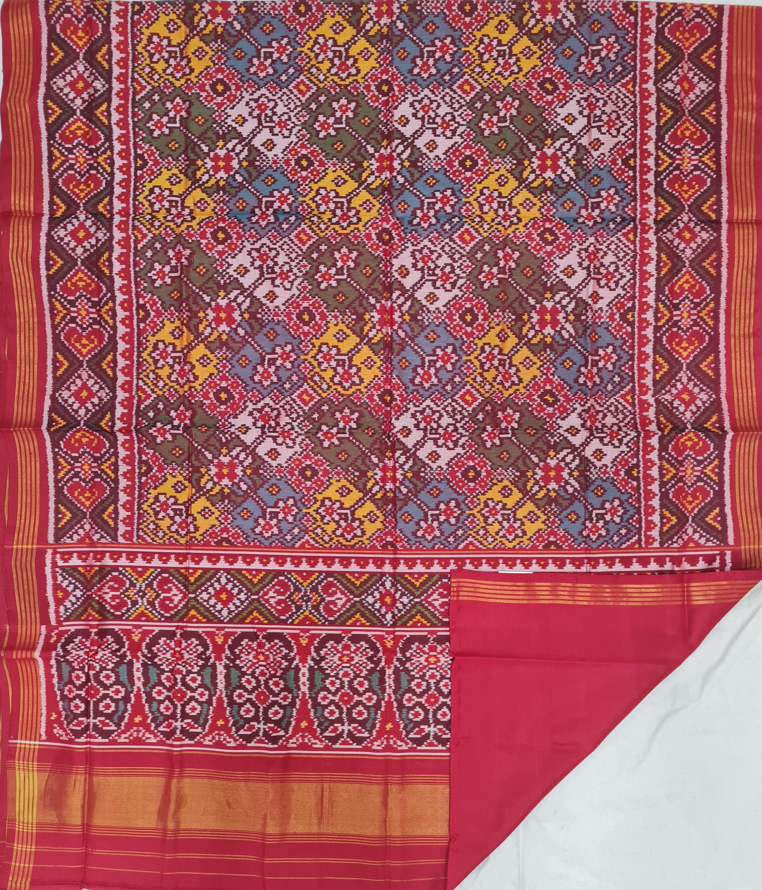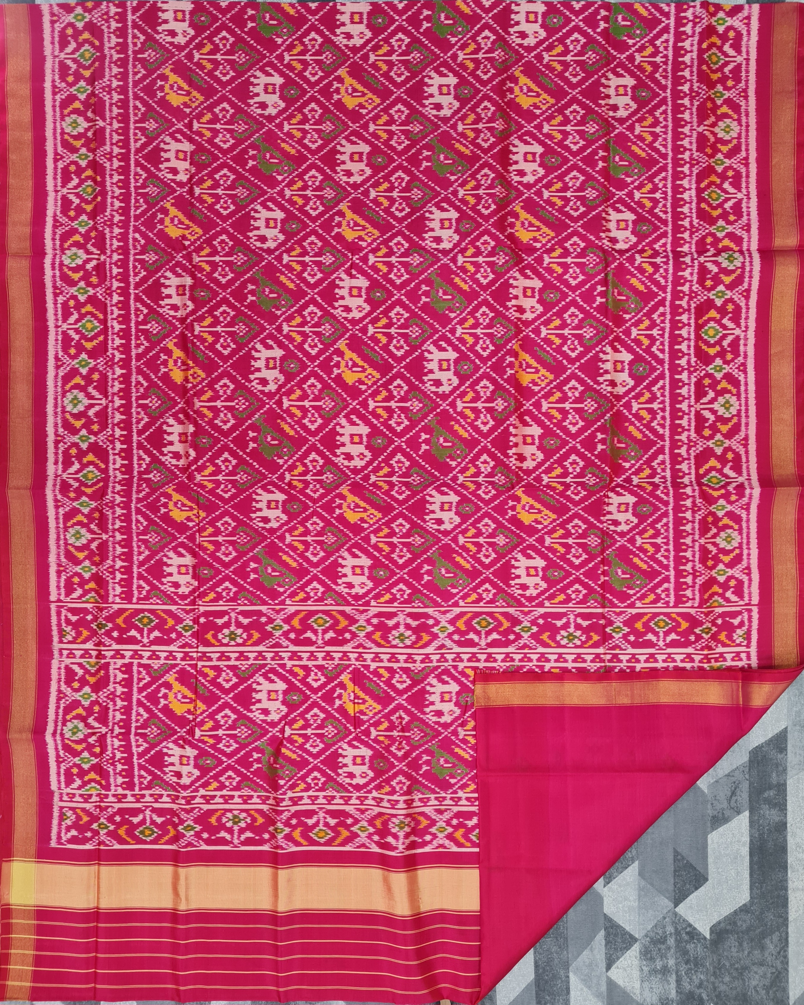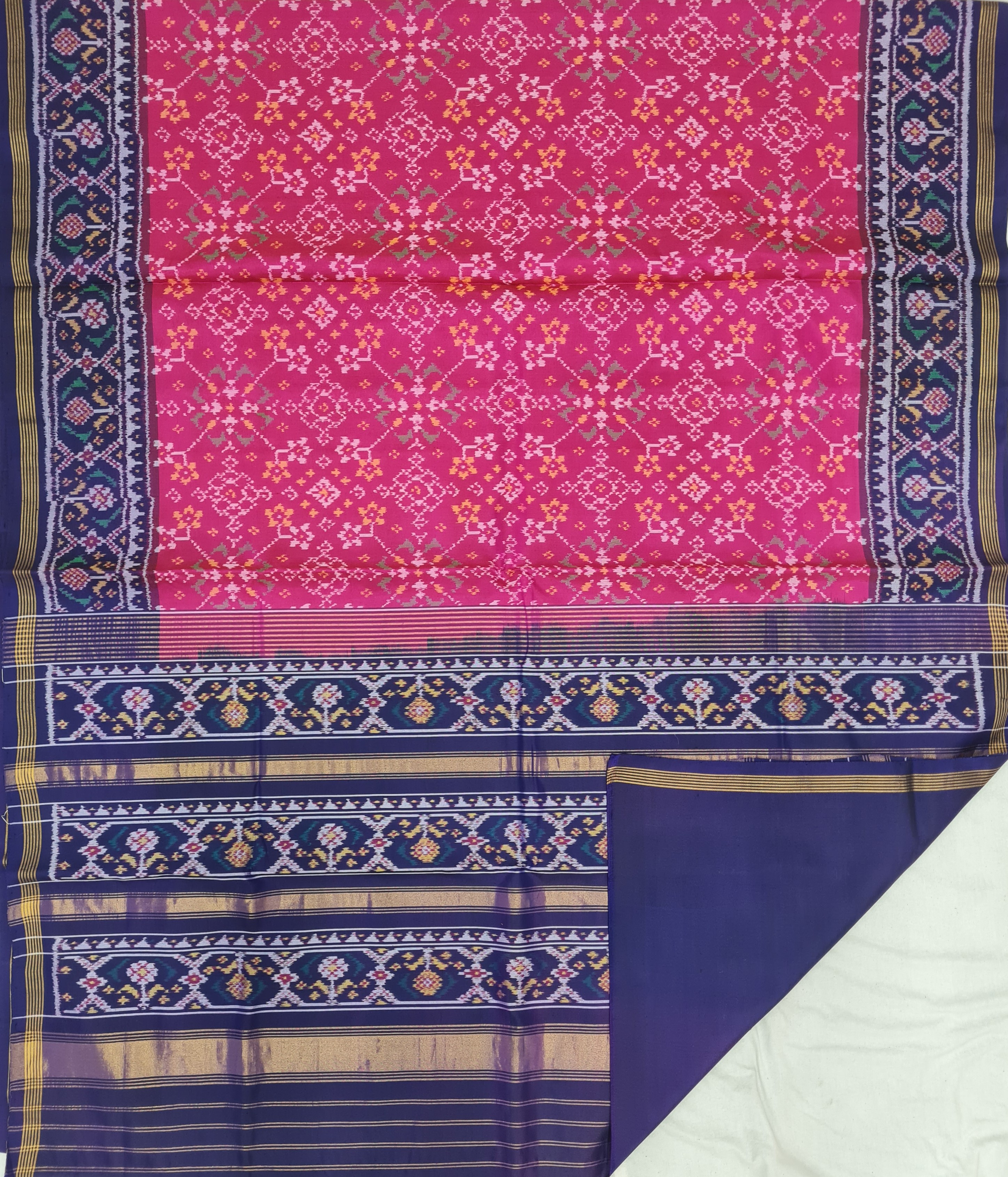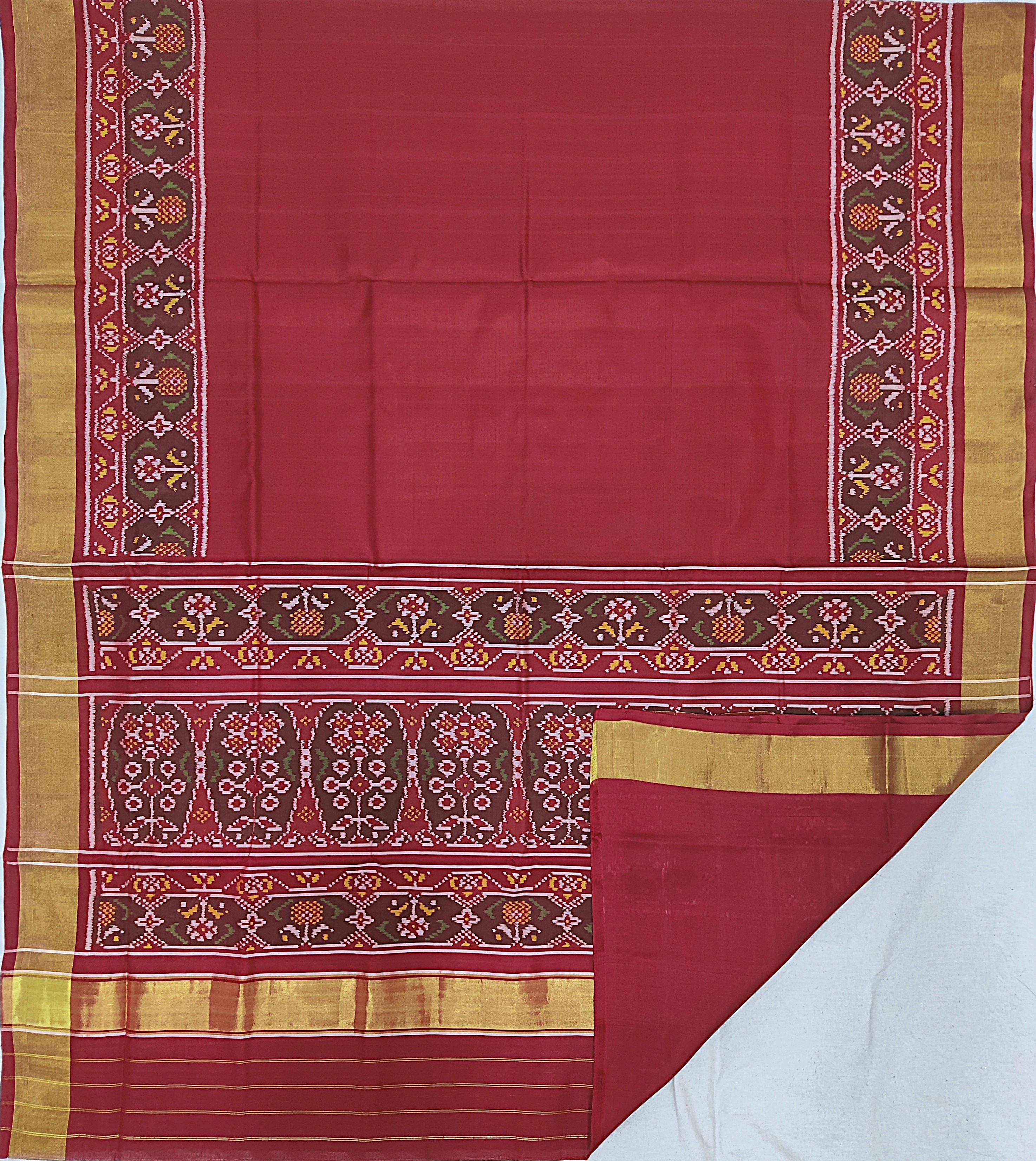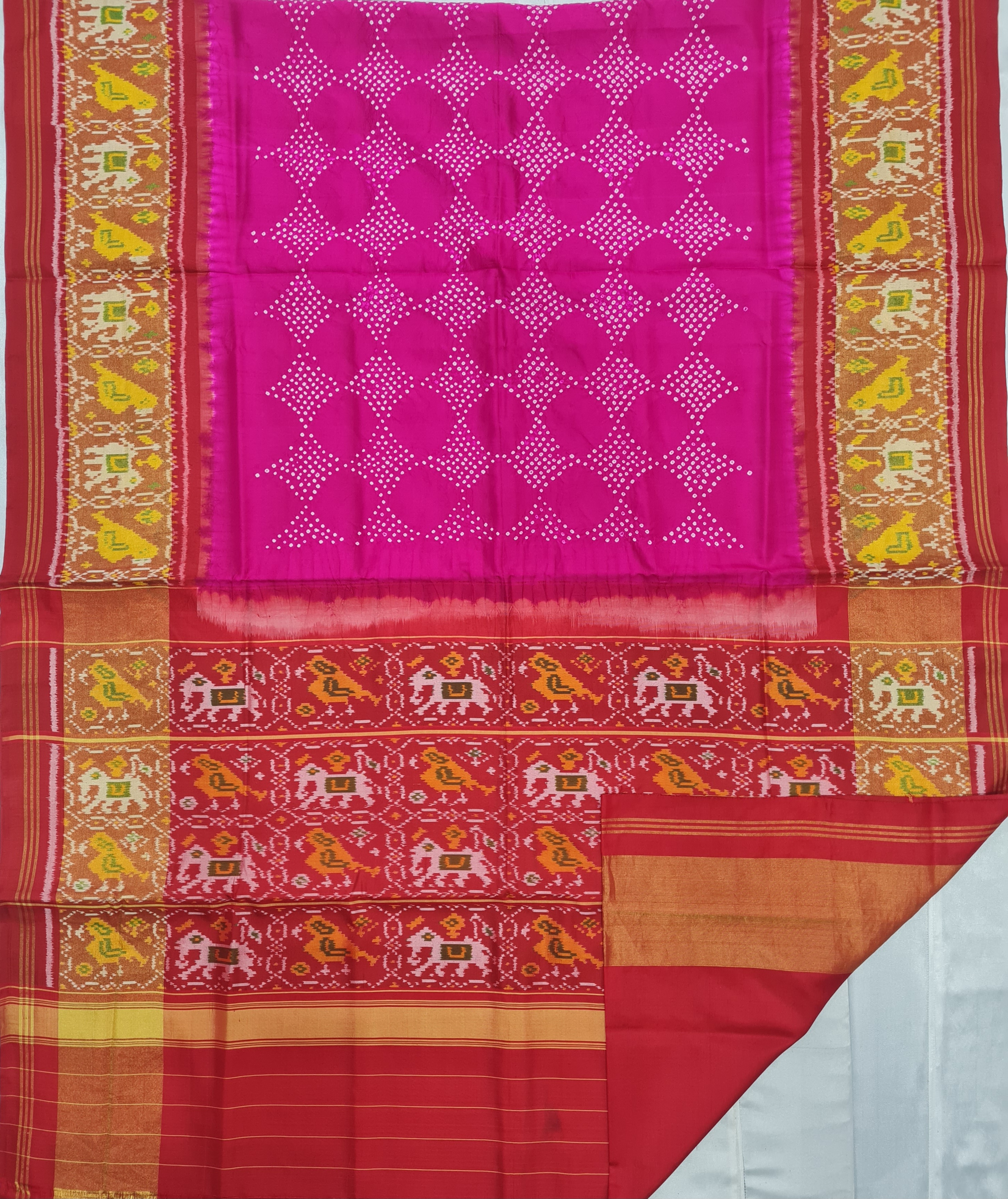 Design: Patola with Bandhani, Color: Pink-Red Material: 100% pure Mulberry silk, Weaving: Single Ikkat. Loom: Handloom Care: Dry clean. *Note: Color variation may occure in real and this product has been woven by hand and may slight irregularities taht are natural outcome of human involvement in the process. T&C apply.