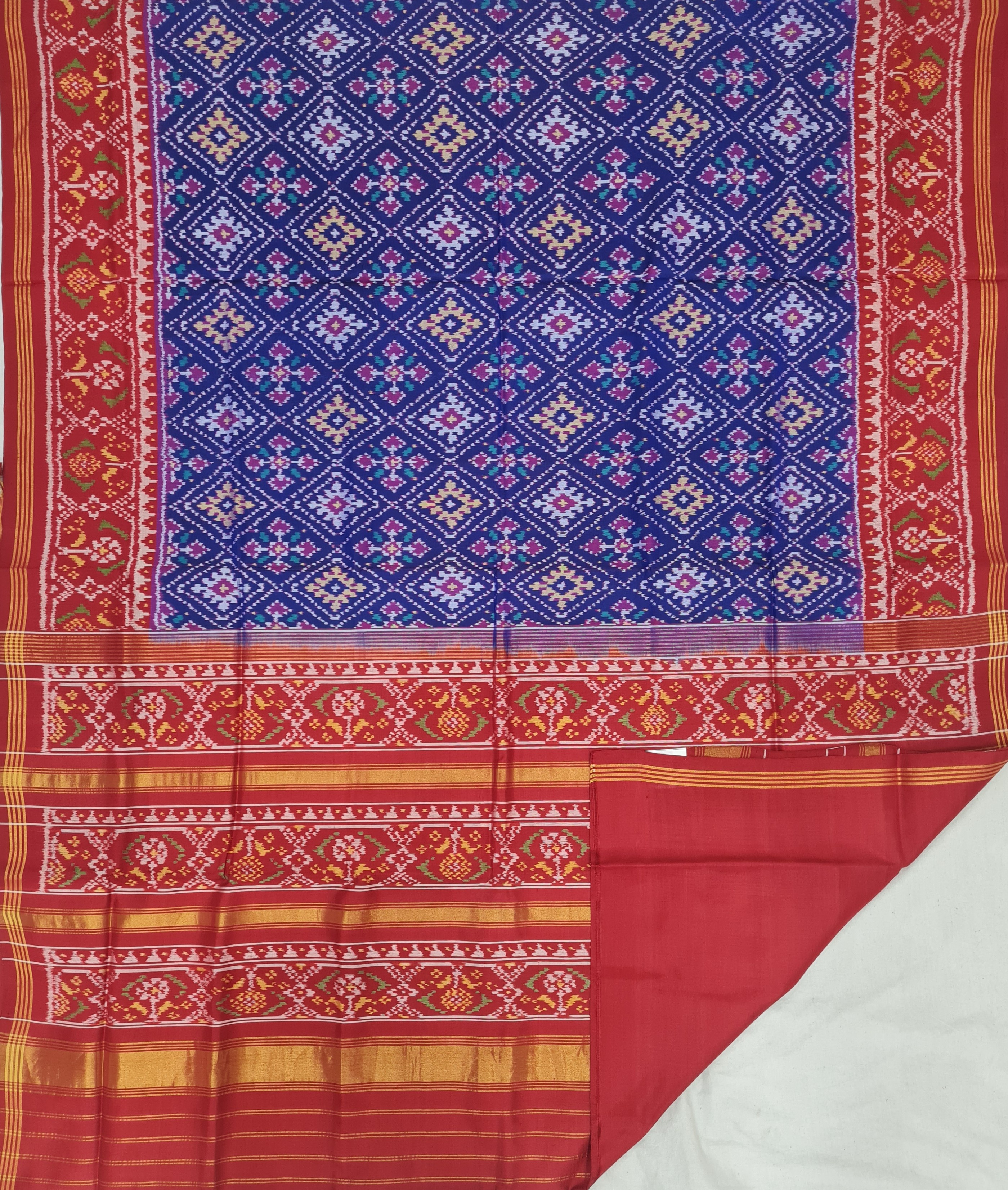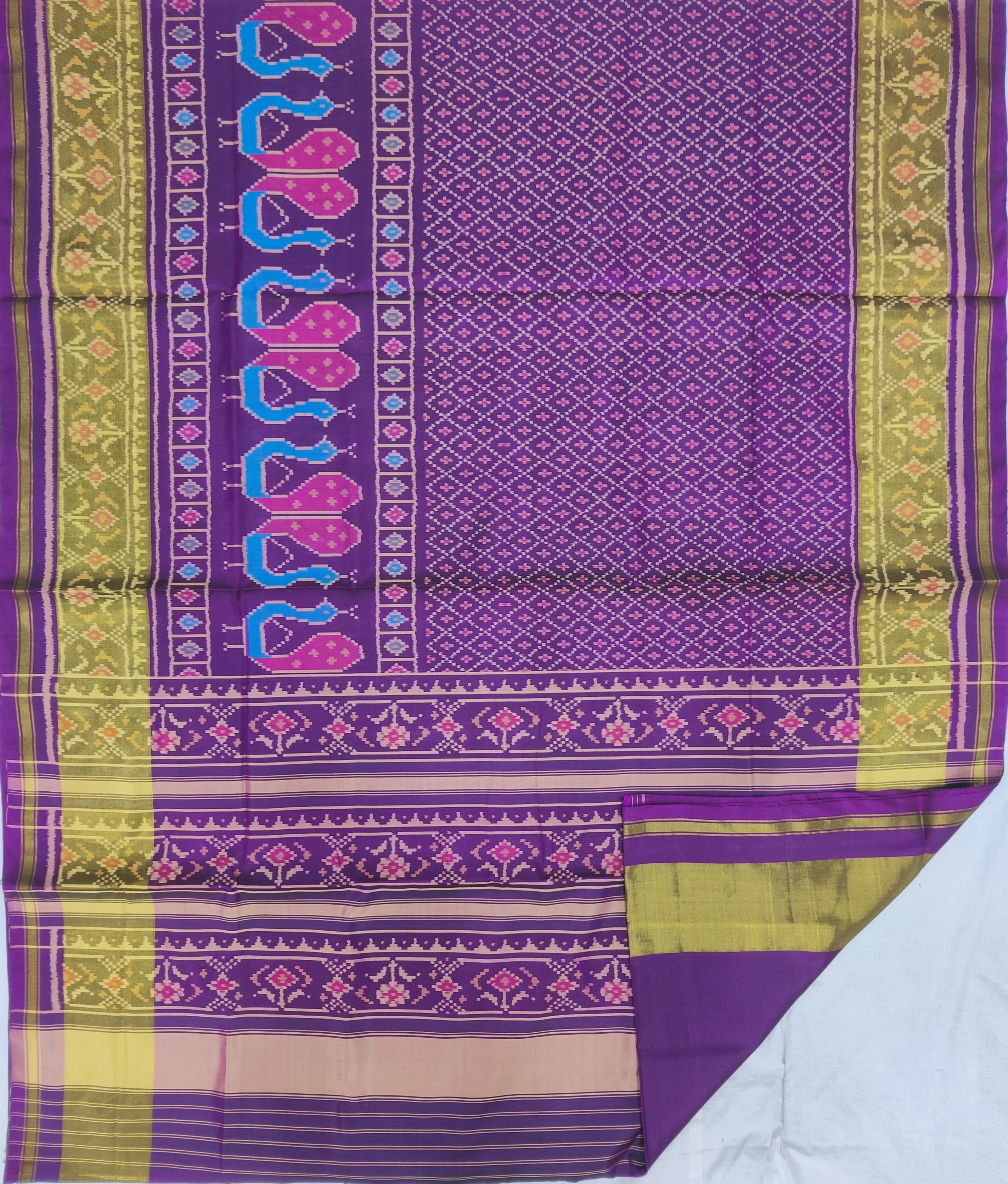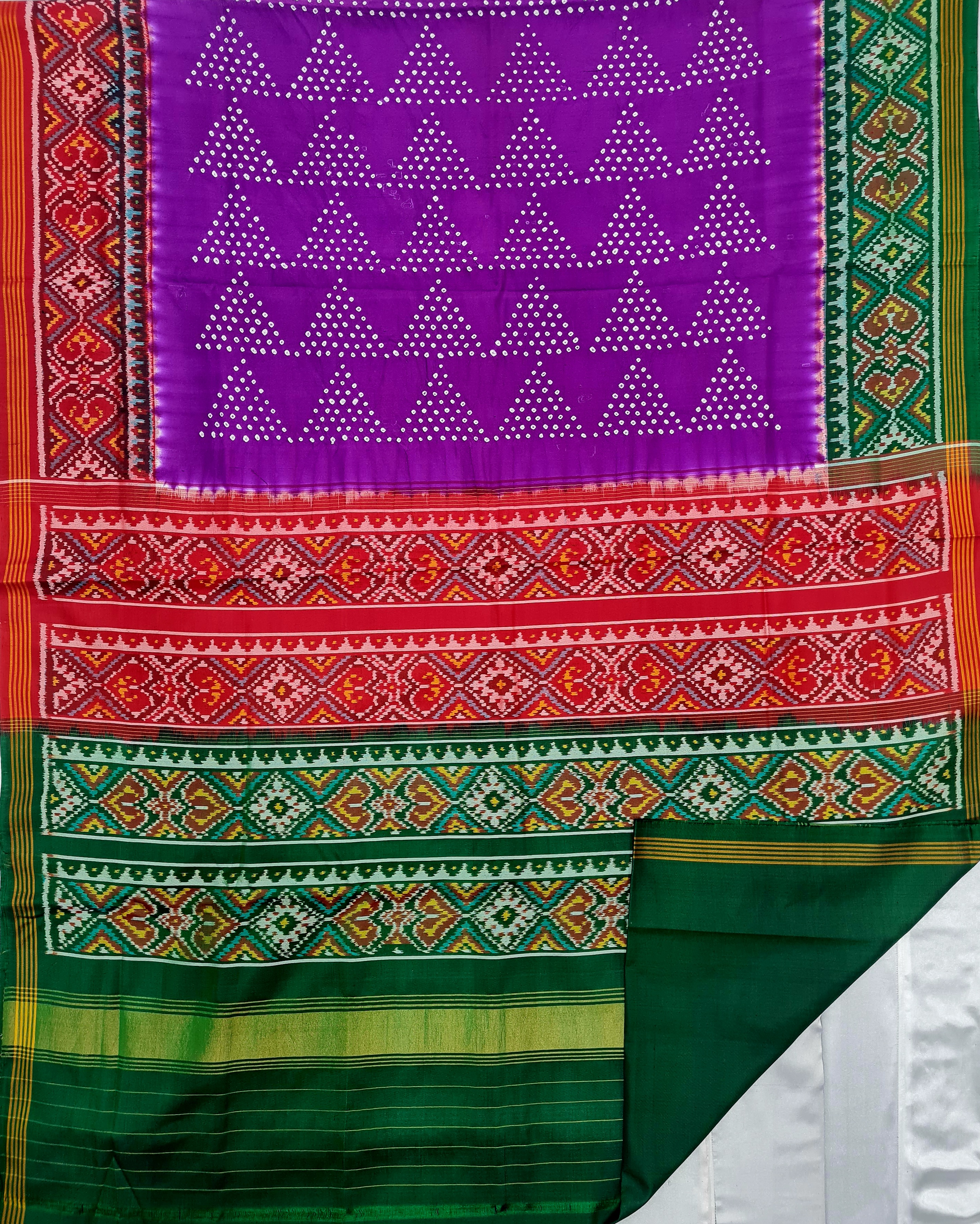 Design: Bandhej with patola, Color: Purple-Ganga-Jamuna Material: 100% pure Mulberry silk, Weaving: Single Ikkat. Loom: Handloom Care: Dry clean. *Note: Color variation may occure in real and this product has been woven by hand and may slight irregularities taht are natural outcome of human involvement in the process. T&C apply.