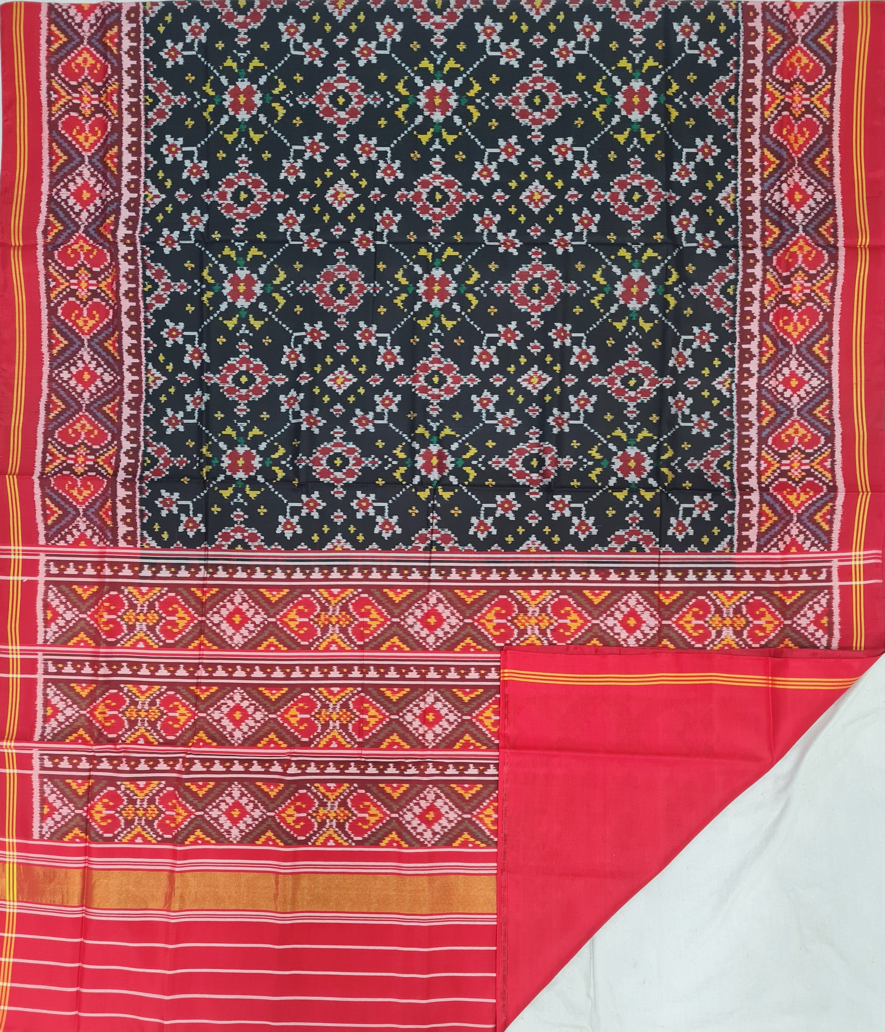 Design: Nauratan, Color: Black Material: 100% pure Mulberry silk, Weaving: Single Ikkat. Loom: Handloom Care: Dry clean. *Note: Color variation may occure in real and this product has been woven by hand and may slight irregularities taht are natural outcome of human involvement in the process. T&C apply.