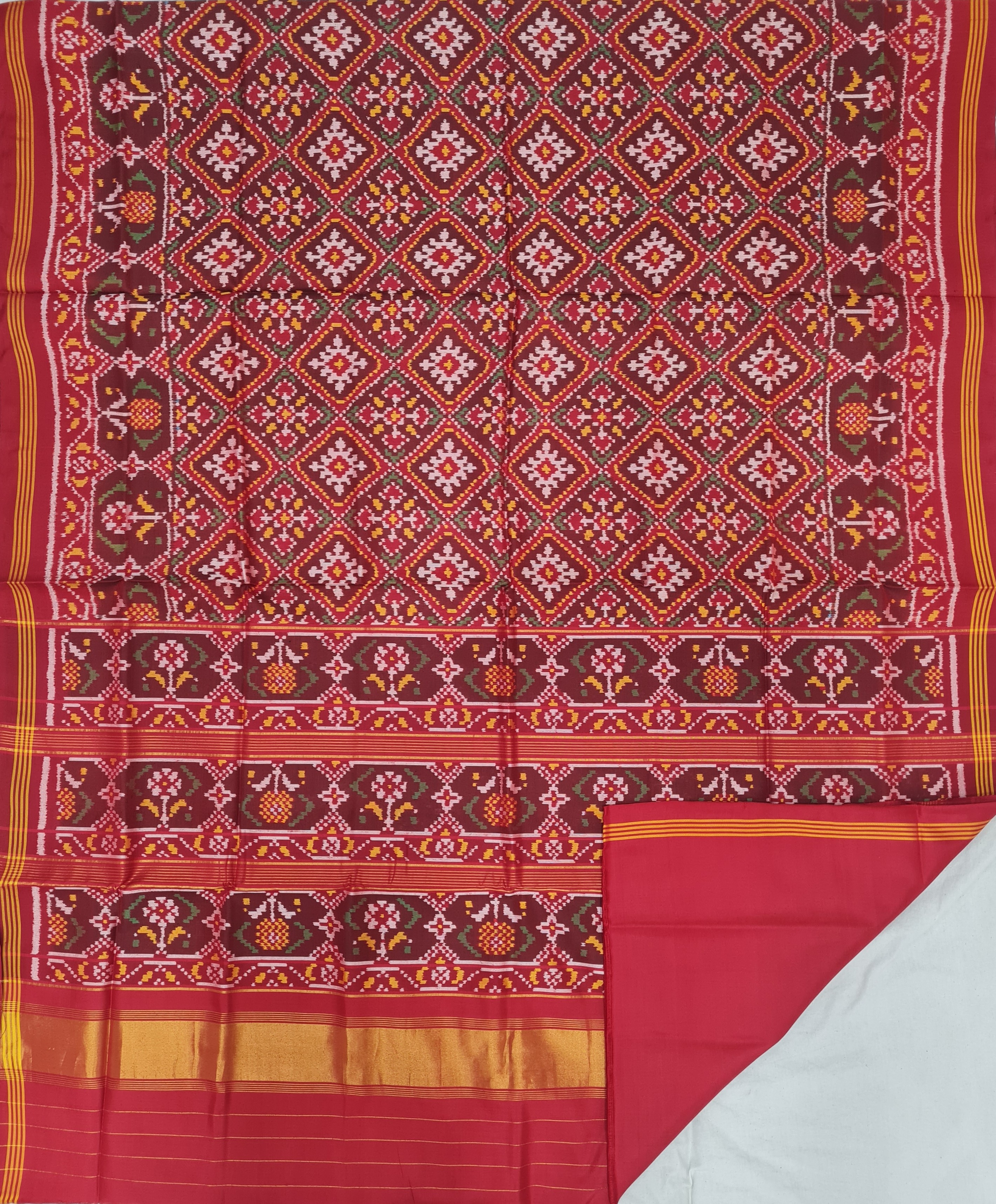Design: Manekchok, Color: White-Red Material: 100% pure Mulberry silk, Weaving: Double Ikkat. Loom: Handloom Care: Dry clean. *Note: Color variation may occure in real and this product has been woven by hand and may slight irregularities taht are natural outcome of human involvement in the process. T&C apply.